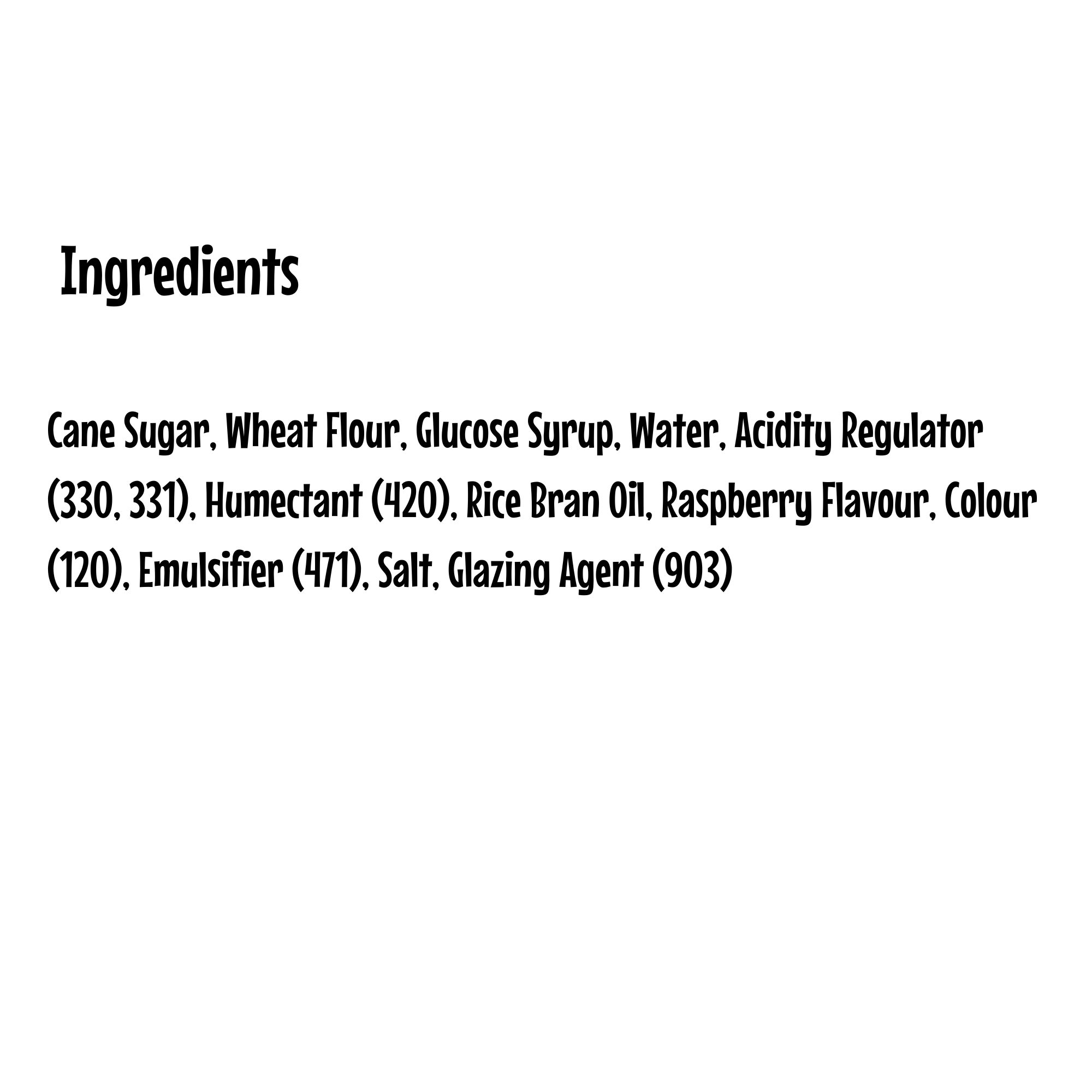 Cane Sugar, Wheat Flour, Glucose Syrup, Water, Acidity Regulator (330, 331), Humectant (420), Rice Bran Oil, Raspberry Flavour, Colour (120), Emulsifier (471), Salt, Glazing Agent (903)