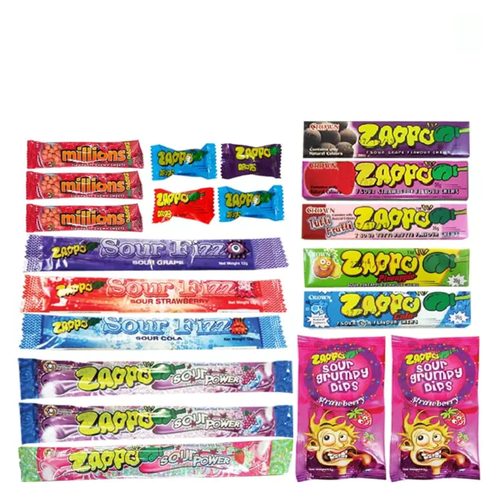 Ultimate Zappo Candy Collection – Includes Zappo Chews, Sour Fizz Bars, Millions, Drops, and more in a fun variety of fruity flavours like pineapple, grape, cola and tutti frutti.
